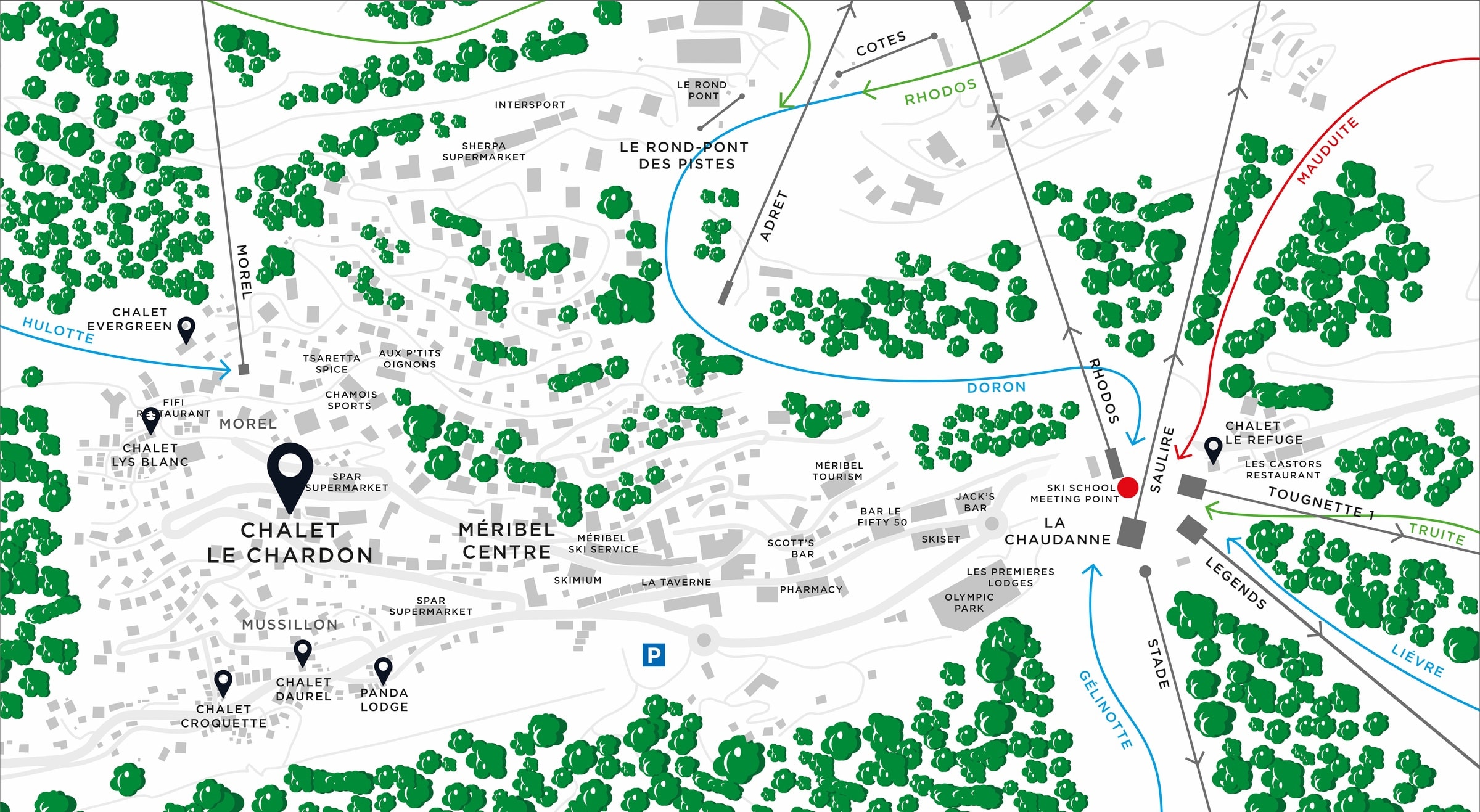 Chalet Daurel is located in a great spot in the heart of Mussillon, approximately 400m from Méribel Centre and very close to the resort’s main supermarché and the resort’s go-to night spot: Sully’s Bar! Getting to and from the slopes is super-easy too as the chalet is just 50m from the Méribus stop.